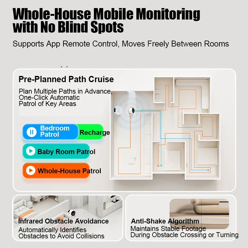 • To regularly check the overall layout and hygiene of each room in the house, you can set the intelligent cruise mode and automatically check on each room.